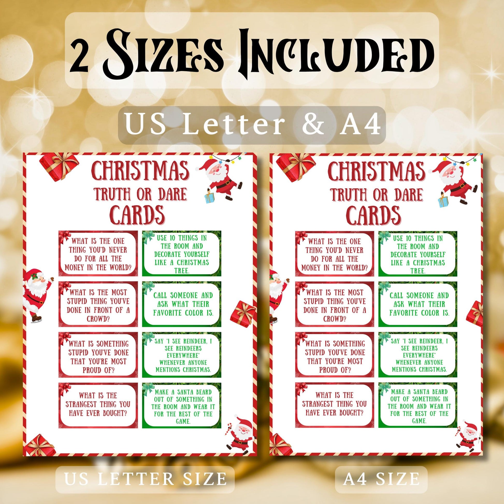 - **Printable PDF:** Includes a set of **truths** and **dares** designed with a Christmas twist, formatted for both **US Letter** and **A4 sizes.**