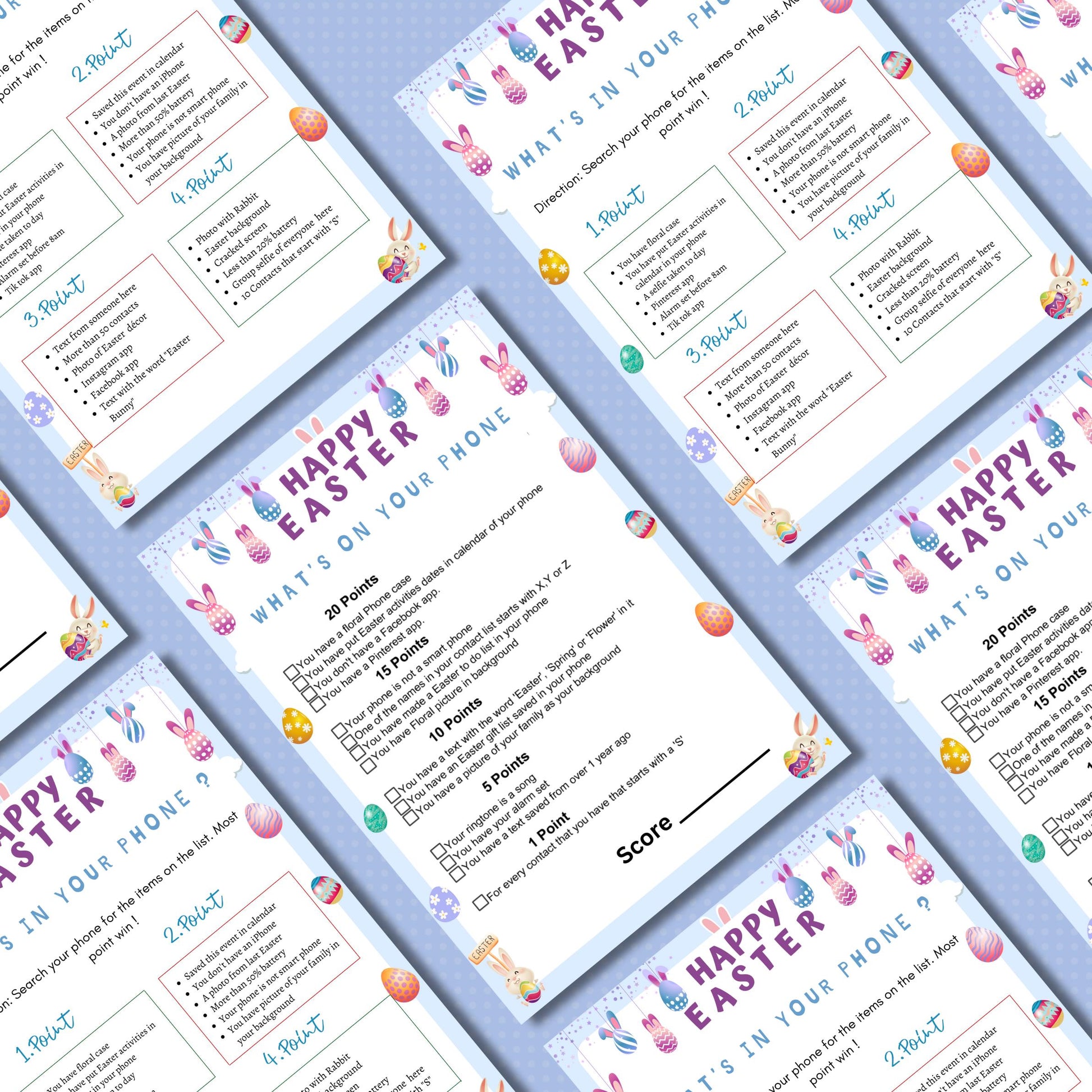 ✔ **Easter-Themed Game Sheet** – Fun prompts to check your phone for points