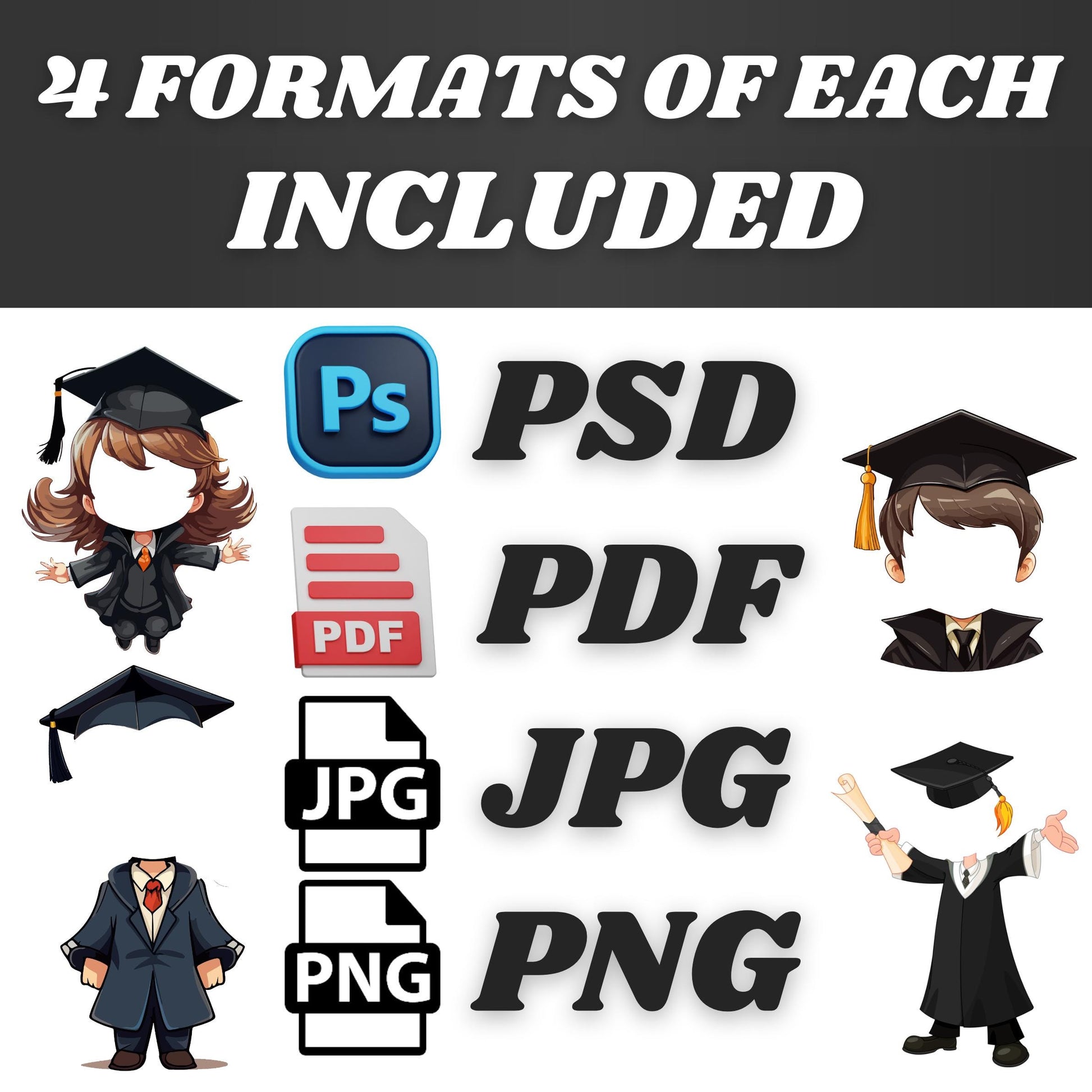 Looking for a fun and unique way to honor a special graduation moment? Our **editable Graduation Cap and Gown Clipart Bundle** lets you add your own face to adorable characters in cap and gown attire โ perfect for friends, couples, and families! Whether you're creating a custom graduation card, party invite, scrapbook, or social media post, this bundle brings joy and creativity to every milestone celebration.