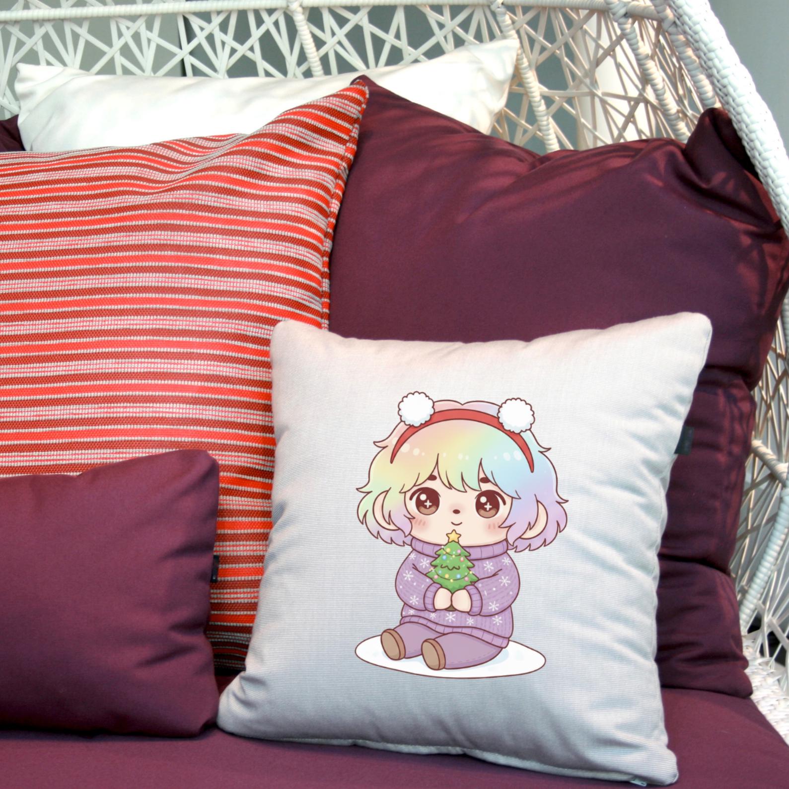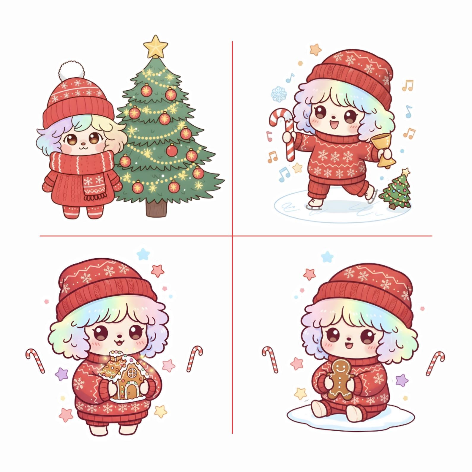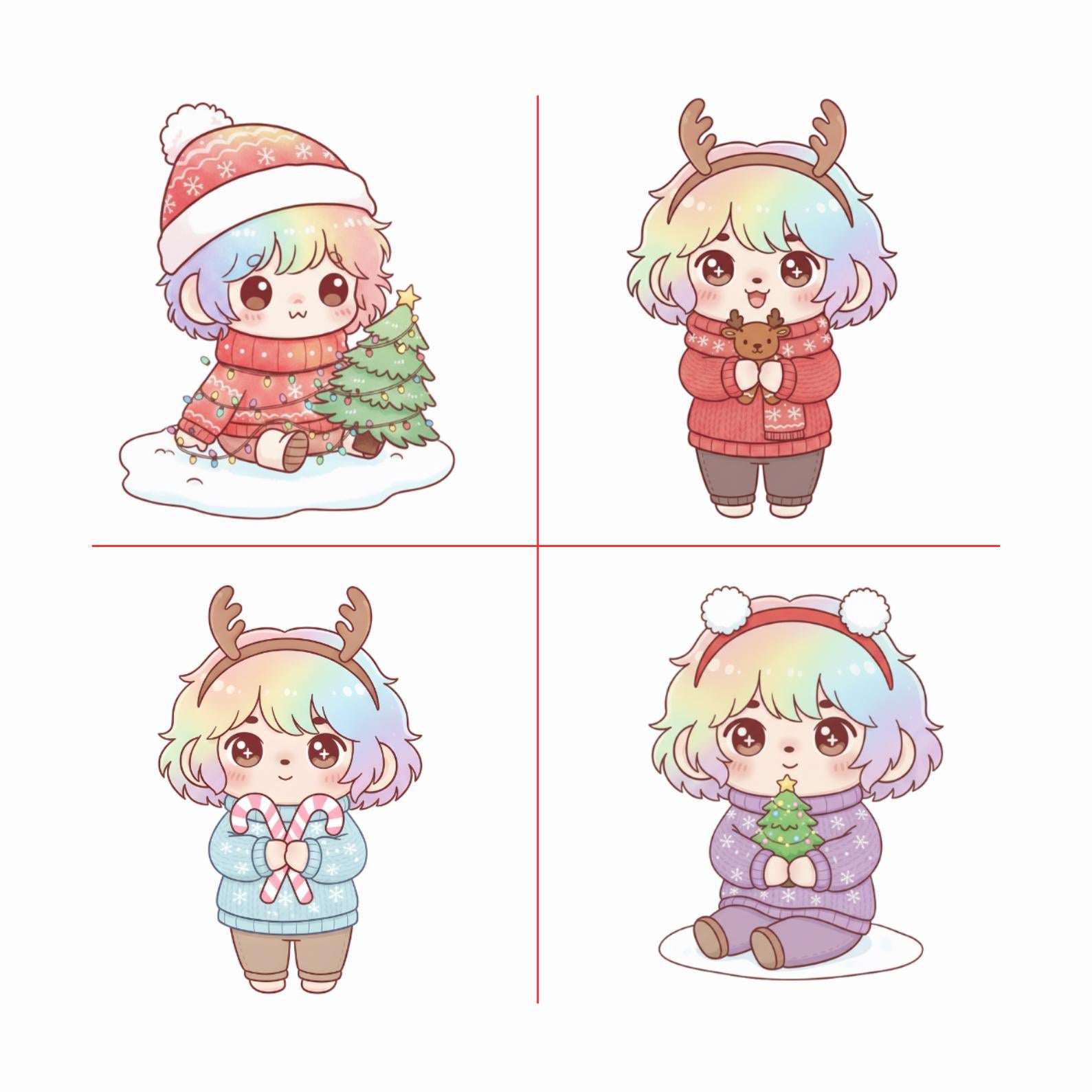 Variety of **kawaii Christmas characters**: Santa, elves, reindeer, snowmen, gifts & more