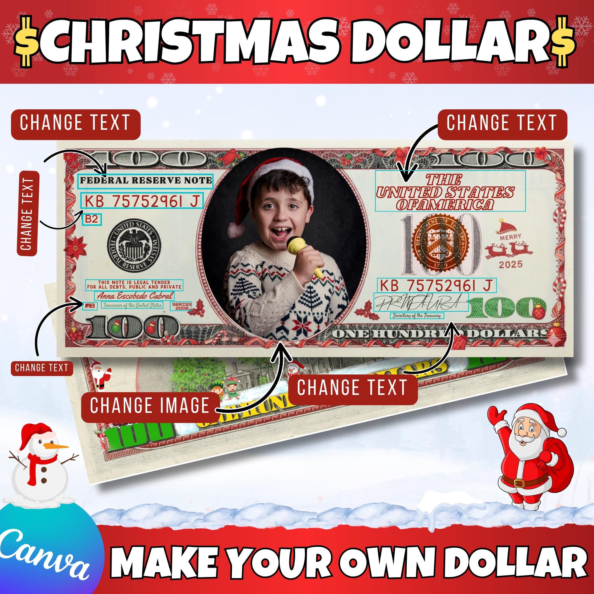 Printable Editable Canva Christmas Dollar Bill Template Add Your Face or Photo to Holiday Money Instant Digital Download for Christmas gift