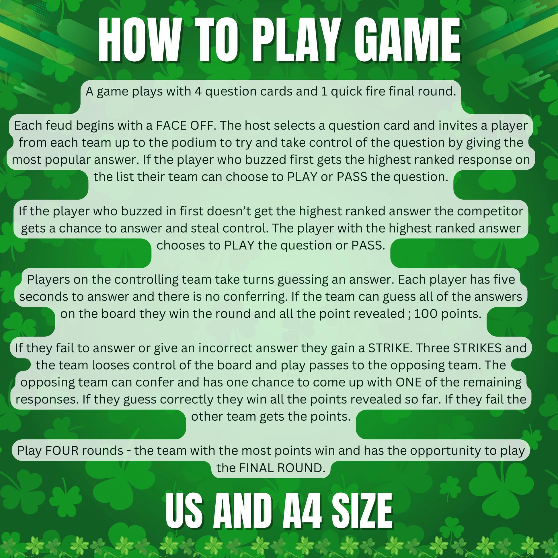 Bring the excitement of Family Feud to your St. Patrick’s Day celebration with this **St. Patrick’s Day Family Feud Game**! This engaging trivia game is perfect for families, parties, classrooms, and more. Featuring fun St. Patrick’s Day-themed questions, it’s an ideal way to keep guests entertained and create lasting memories during your St. Paddy’s festivities.
